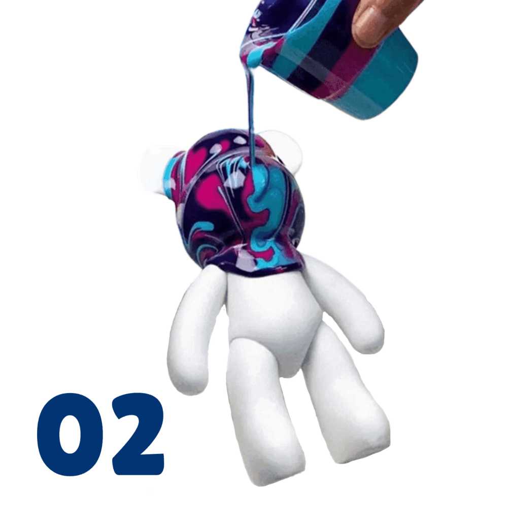 Mélangez puis versez les peintures acryliques pour créer un style unique et reconnaissable. Une étape simple et accessible à tous, quel que soit l’âge.